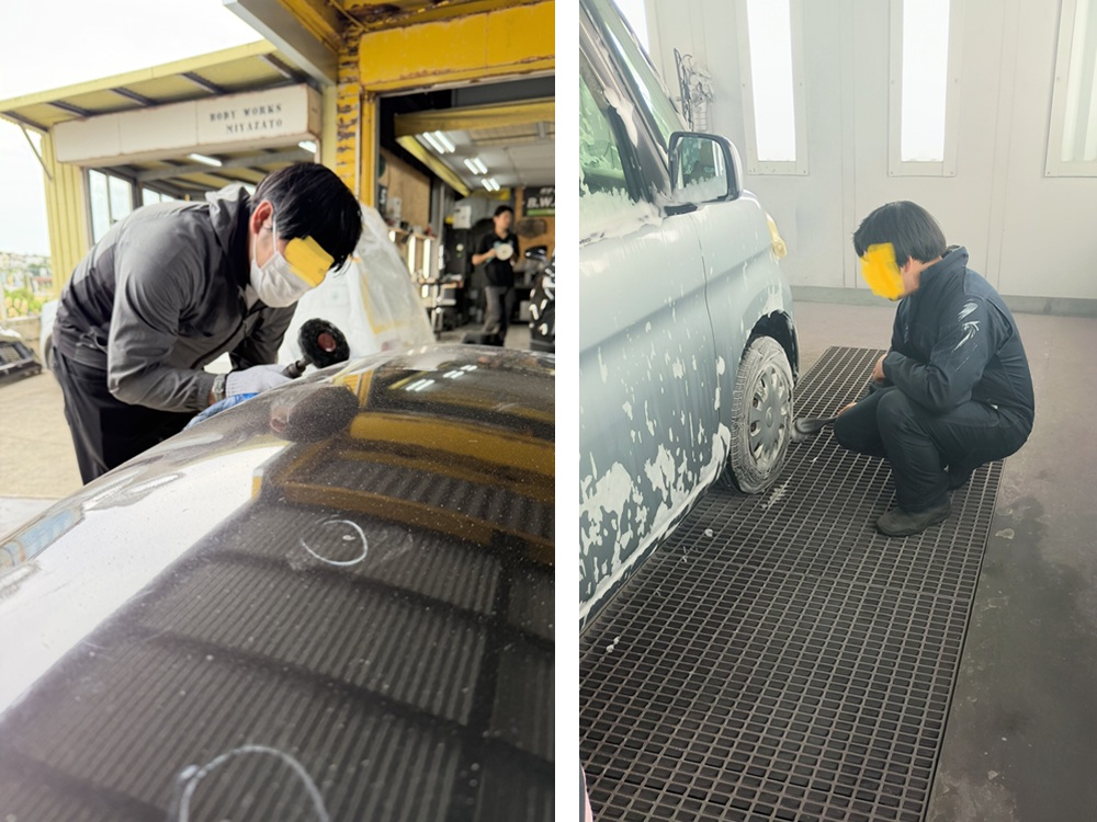 就労支援施設における県内唯一であろう、車の板金塗装の下処理~吹き上げなどの準備作業や、ヘッドライトリペア(研磨・コーティングなど)、販売用自動車の洗車・車内清掃など、クルマ好きにはたまらない作業を行っております。